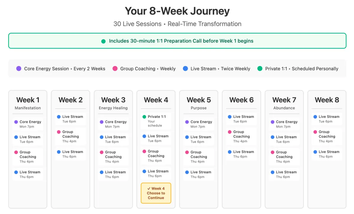 The Energy Healing session is included in your 2 Core Energy Sessions within the first 4 weeks and available throughout the 8 Live Guidance Streams, giving you multiple opportunities to experience this transformational work even if you choose not to continue after 4 weeks.